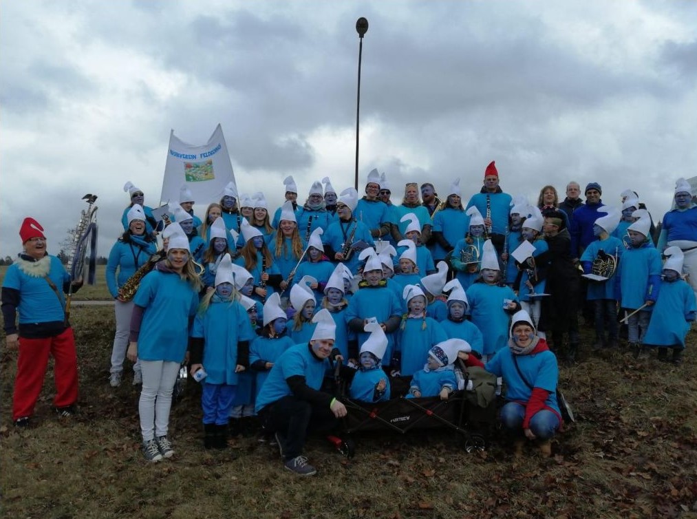 oder „Narri, narro!“. Ja, eigentlich hätten wir am vergangenen Samstag als Rennicher Schlümpfe auf dem Faschingsumzug in Dennach musiziert. Der Faschingsumzug musste, wie so Vieles, aufgrund der aktuellen Situation leider ausfallen. Da ich schon ganz traurig darüber war und wenigstens ein bisschen Fasching bei mir zu Hause haben wollte, habe ich geschaut, was in den vergangenen Jahren so los war. Da habe ich so einiges entdeckt. Die Jungmusiker trafen sich meist am späten Vormittag. Noch einmal wurden die stimmungsvollen Faschingslieder geübt, sodass die Narren am Straßenrand damit erfreut werden konnten. Da fleißiges Proben hungrig macht gab es natürlich eine Stärkung. Alle Musiker konnten sich bei heißen Saiten, Brötchen und Getränken stärken. Anschließend konnte die Verwandlung zum Schlumpf beginnen. Schnell ins Schlumpfoutfit geschlüpft, schon wurden die Jungmusiker mit blauer Schlumpffarbe geschminkt. Dann konnten schon einige Rennicher Narren mit den Faschingsliedern erfreut werden. Und schon ging es endlich los in Richtung Dennach. Im ganzen Ort war bereits ein buntes Treiben, unter das sich nun auch die Rennicher Schlümpfe mischten.