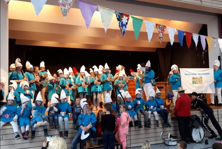Der Startschuss für den Umzug fiel und somit spielten die Jungmusiker auch ihr erstes Musikstück. Das Repertoire hat sich im Laufe der Jahre stets erweitert. Auf Wunsch einiger großer Schlümpfe kam das Stück „Babylon“ hinzu. Und natürlich durfte auch das „Lied der Schlümpfe“ nicht fehlen. So tanzten alle Narren begeistert am Straßenrand zur schwungvollen Faschingsmusik. Zum Abschluss trafen sich alle Narren in der Dennacher Turnhalle. Auch hier durften die Rennicher Schlümpfe ihre beliebtesten Hits präsentieren.